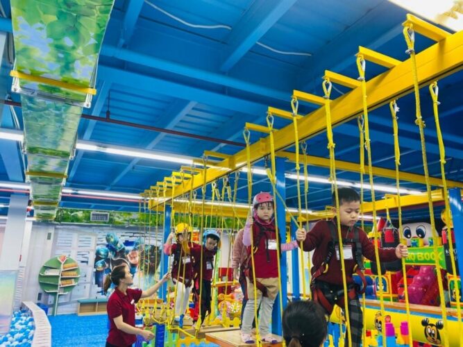 - Lắp đặt các thiết bị vui chơi chính: như cầu trượt, nhà bóng, khu vực leo núi, tường tương tác, v.v.